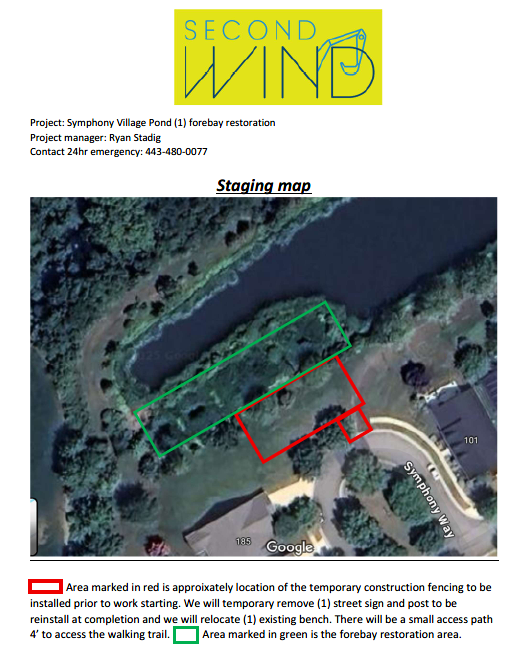 To meet regulatory requirements, the sediment and debris removed from the forebay will be temporarily placed in the turf area between Pond 1 and the cul-de-sac at the end of Symphony Way to dry. Once the material has dried adequately, it will be hauled offsite in trucks for proper disposal. A map showing the approximate location of the sediment/debris drying and equipment staging area supplied by the contractor is provided below for your reference.