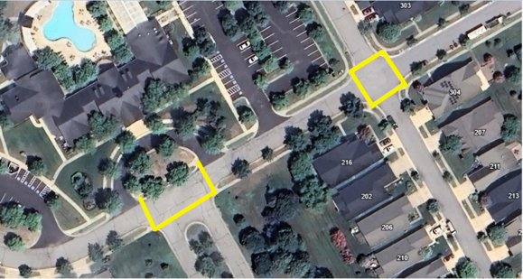 A contractor hired by the Town of Centreville is scheduled to install crosswalks along Symphony Way (a Town-owned street) on Monday, November 24, weather permitting. The installation areas—located in front of the Clubhouse and at the intersection of Harmony Way and Symphony Way—are marked in yellow on the map below.