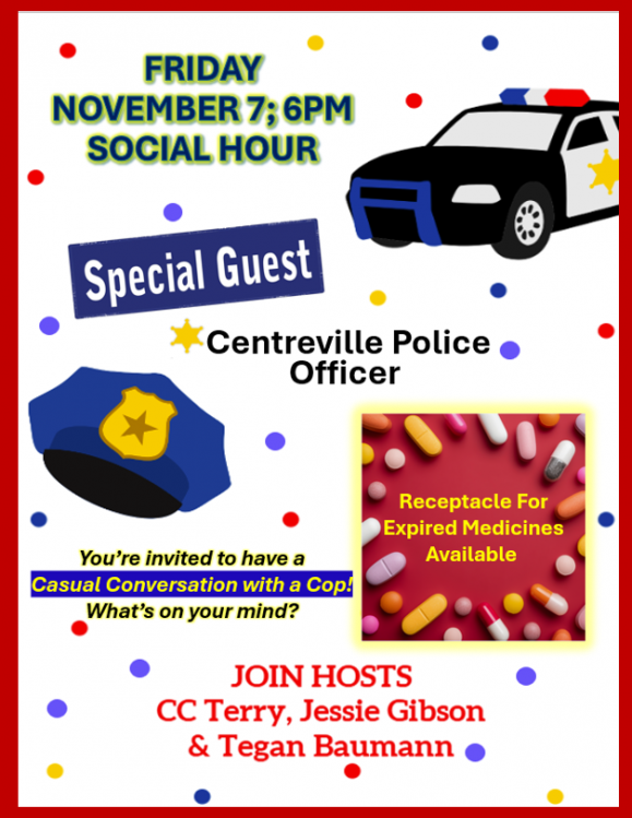 A Centreville Police Officer will be on hand to talk on whatever topic you'd like!
