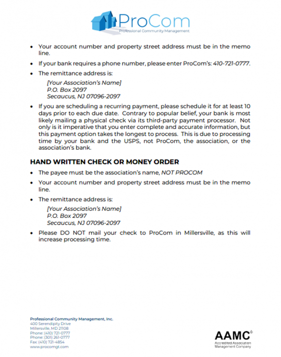 If you have any questions regarding your assessment payments or payment options, please contact the Management Office at 410-758-8500 or rwagner@PROTECTED.